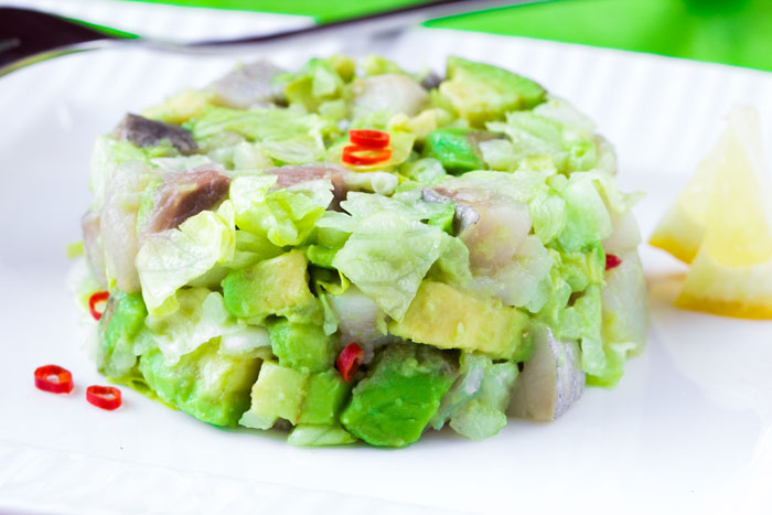 1 apelsino, 1 pakuotės „Kuljanka“ marinuotos silkės, 1 avokado, šaukšto alyvuogių aliejaus, pusės šaukštelio medaus, druskos, pipirų.