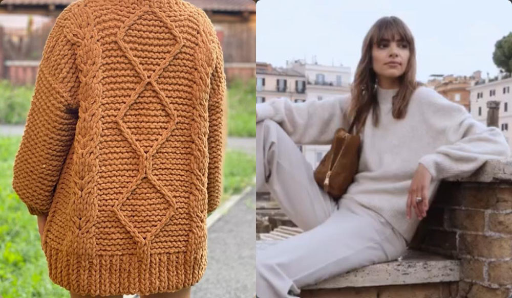 Pynės, rombai, geometriniai pynimai ar tekstūriniai pynimai sukuria gilumą. Tai tas atvejis, kai megztinis tampa pagrindiniu visos aprangos elementu, o net minimalistinės kelnės ar sijonas atrodo įdomiai dėl tekstūros.
