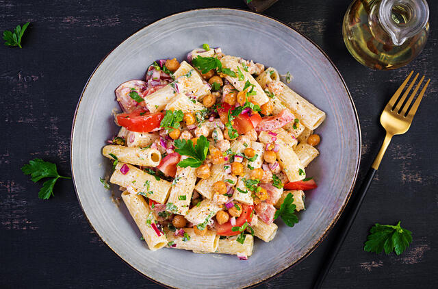 Makaronų salotos su avinžirniais ir daržovėmis dviems vos už 4 eurus