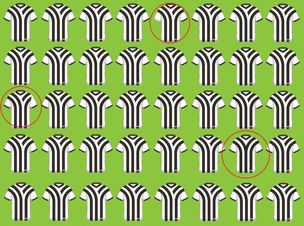Atidžiai pažiūrėkite į paveikslėlį žemiau. Tarp dešimčių juodų ir baltų marškinėlių yra trys, kurie skiriasi nuo kitų. Vienas iš jų turi kitokį iškirptę, kitas – trumpesnes rankoves, o gal juostelė yra ne ten, kur reikia...