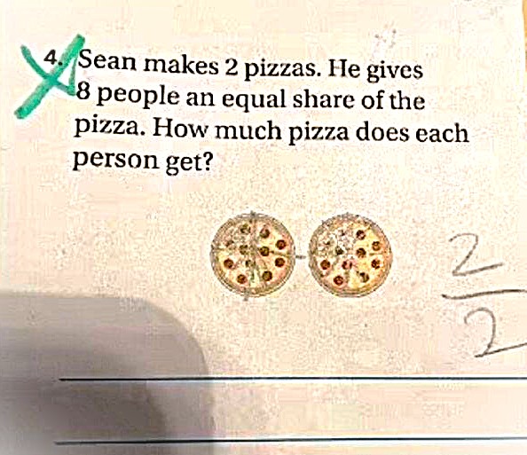 Užduotis skamba taip: “Šonas kepa dvi picas. Jis aštuoniems žmonėms dalina po lygią picos dalį.“