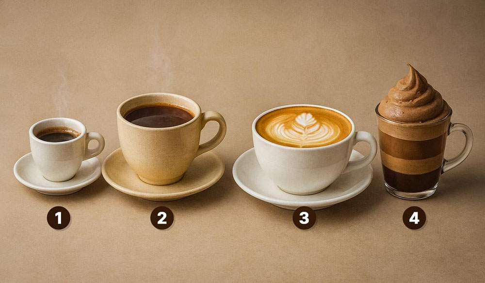 Paveikslėlyje pavaizduoti keturi populiarūs kavos gėrimai. Pagalvokite, kurio iš jų jums dabar labiausiai norėtųsi išgerti. Rinkitės ne logikos, o intuicijos pagrindu – tuomet pasirinkimas bus nuoširdus.