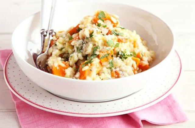 Patikrinkite, ar ryžiai išvirė. Jei ne - supilkite daugiau sultinio ir leiskite dar pavirti. Kai ryžiai taps pakankamai minkšti, įmaišykite sūrį ir moliūgą.