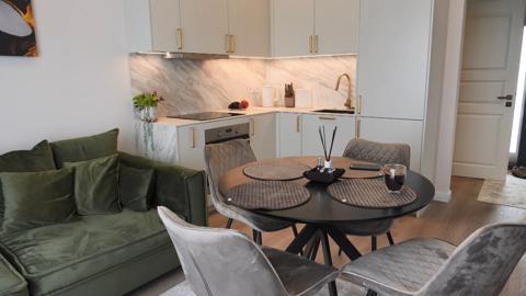 Trijų kambarių apartamentuose, nesiekiančiuose net pusšimčio kvadratinių metrų telpa, rodos, viskas, ko reikia jaukiam šeimyniniam poilsiui: ne tik du miegamieji, virtuvė, svetainė, tačiau ir valgomasis keturiems asmenims.