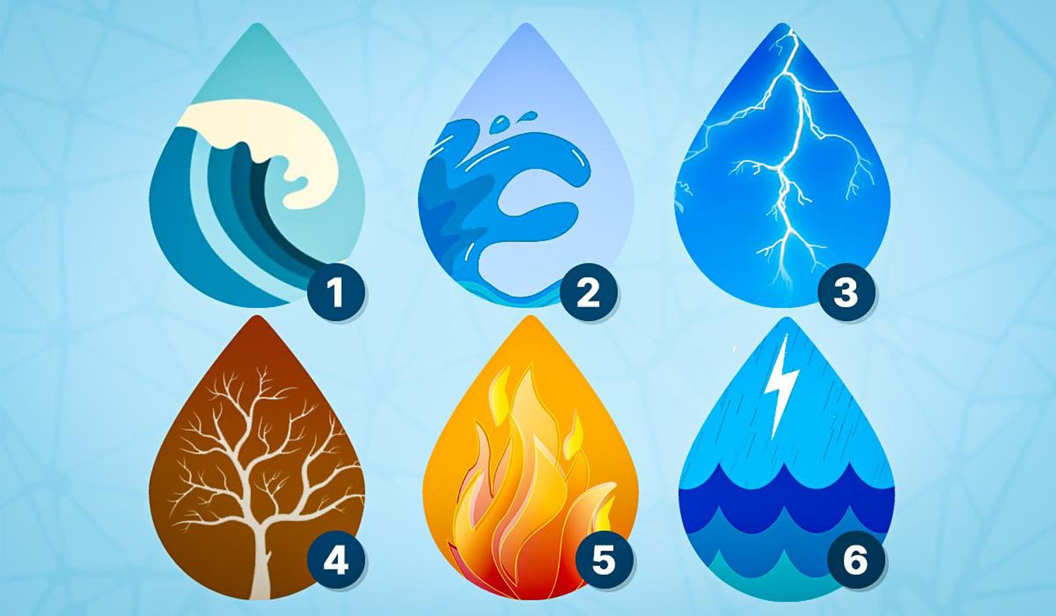 Pažvelkite į paveikslėlį su šešiomis stichijomis ir pasirinkite vieną, kuri geriausiai atitinka jūsų vidinius jausmus. Paklausykite savo intuicijos ir perskaitykite savo pasirinkimo aiškinimą.