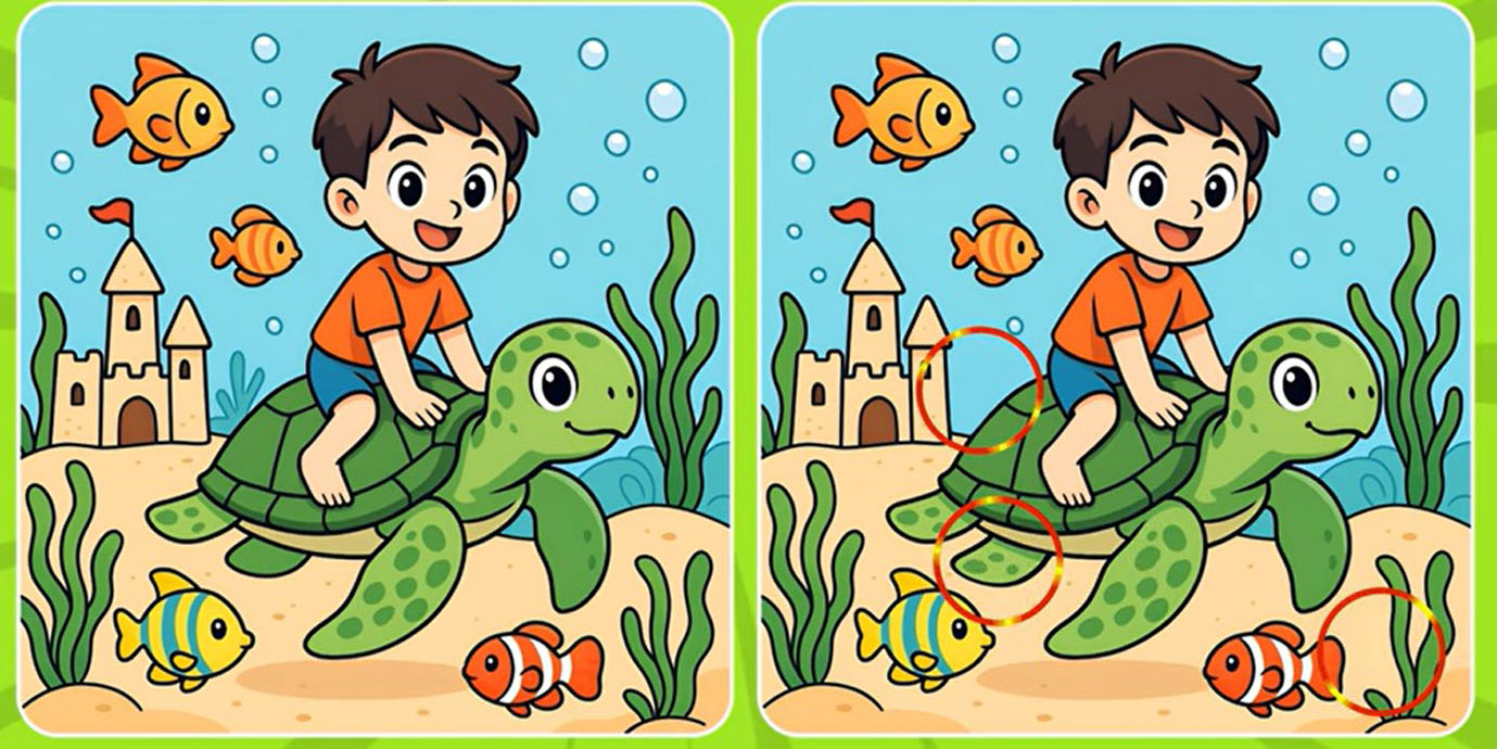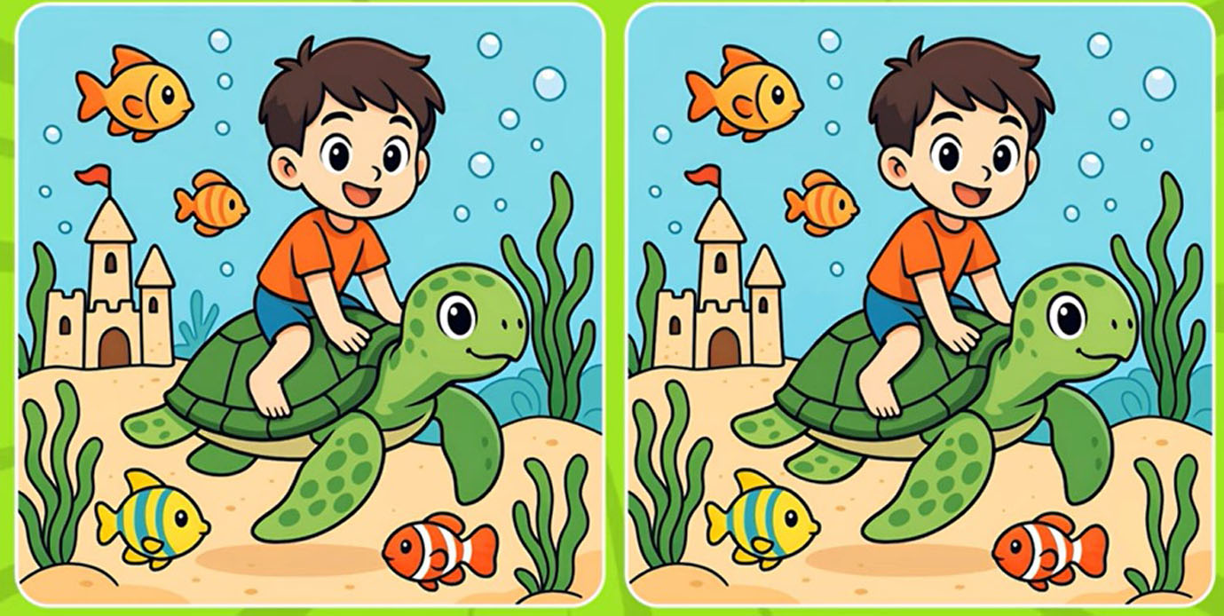Priešais jus – dvi povandeninės iliustracijos, kuriose berniukas, sėdėdamas ant vėžlio, tyrinėja jūros karalystę. Atrodo, kad viskas yra vienoda – žuvys plaukioja, dumbliai siūbuoja, pilis stovi. Tačiau, jei įjungsite režimą „Šerlokas atostogauja“, pastebėsite, kad kažkas pasikeitė.