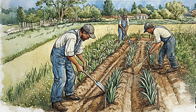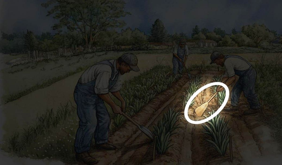 Iš karto pamatysite lauką netoli vaizdingo kaimo ir tris vyrus, dirbančius lauke.