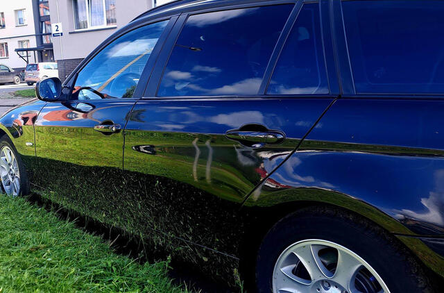 Pirmadienį Veterinarijos gatvės daugiabučio namo kieme palikti jų automobiliai atrodė lyg pasivažinėję po pievą - mašinos buvo apdrabstytos ką tik nupjauta žole.