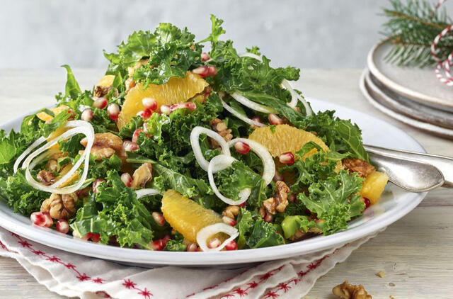 Kopūstą sumaišykite su apelsinų filė ir baltaisiais svogūnais. Viršų apibarstykite granatų sėklomis ir graikiniais riešutais.
