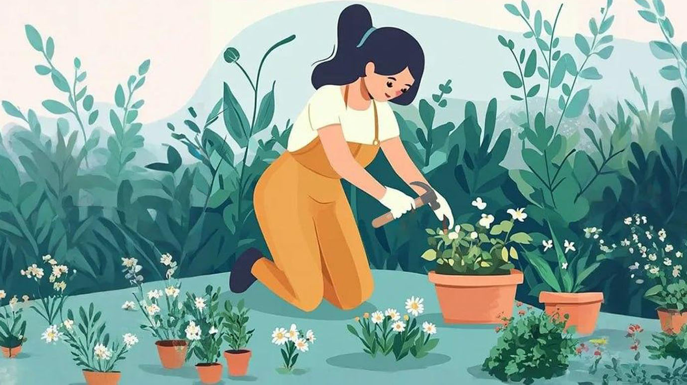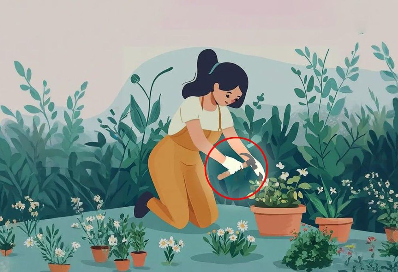 Paveikslėlyje pavaizduota sode dirbanti moteris. Iš pirmo žvilgsnio tai, kas vyksta, gali atrodyti normalu, tačiau paveikslėlyje yra viena juokinga detalė.