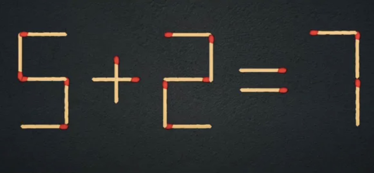 Kad lygtis taptų teisinga, paimk vieną degtuką iš skaičiaus 6, paversdamas jį 5, ir pridėk tą degtuką prie vieneto, paversdamas jį 7.