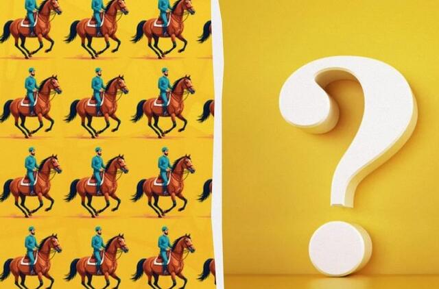 Pamatysite koliažą su dešimtimis žokėjų ant žirgų. Visi jie vienodi, išskyrus vieną.