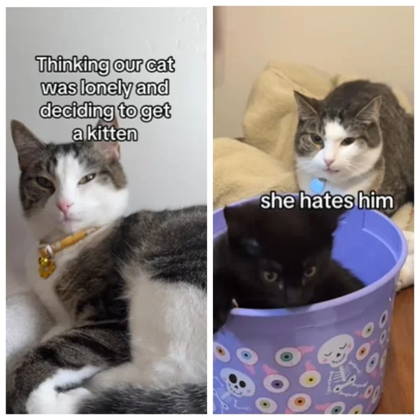 Susirūpinę sutuoktiniai nusprendė savo naminei katei įsigyti mažą kačiuką, norėdami, kad ji nesikankintų dėl vienatvės. Tačiau pora nebuvo pasirengusi tokiam mylimosios reakcijai į pūkuoto mažylio atsiradimą namuose.