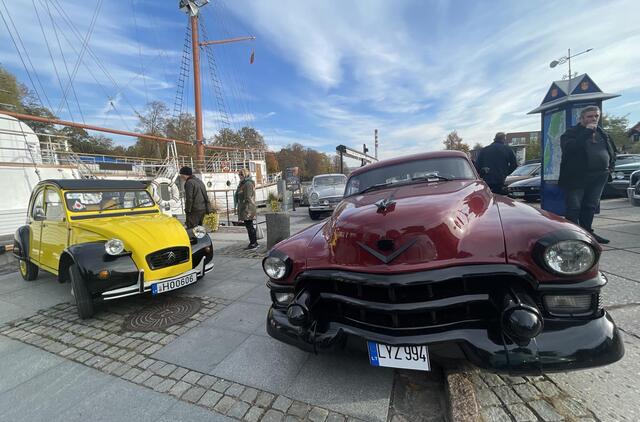 Klaipėdiečiai su šeimomis grožisi senovinių automobilių ekspozicija ir prie jų noriai fotografuojasi.