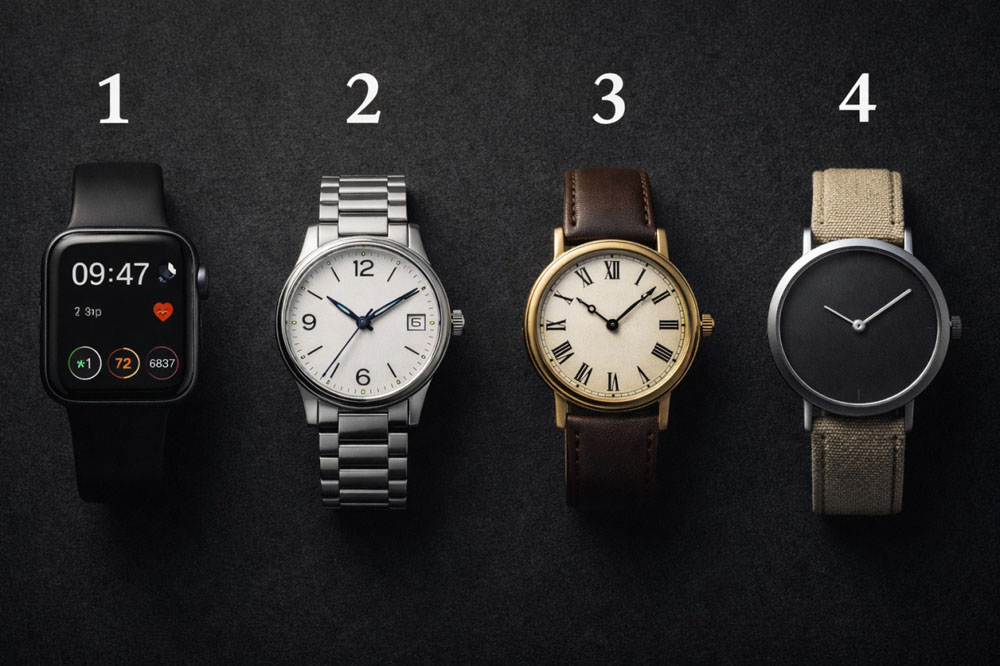 Pažvelkite į keturis laikrodžių variantus ir išsirinkite tą, kurį norėtumėte dėvėti būtent dabar. Nesirinkite „teisingo“ – rinkitės tą, kuris jums artimiausias.