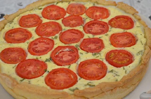 - Pyragą kepkite 30 minučių. Išimkite paruoštą pyragą su varškės įdaru ir pomidorais iš formos, palikite šiek tiek atvėsti.