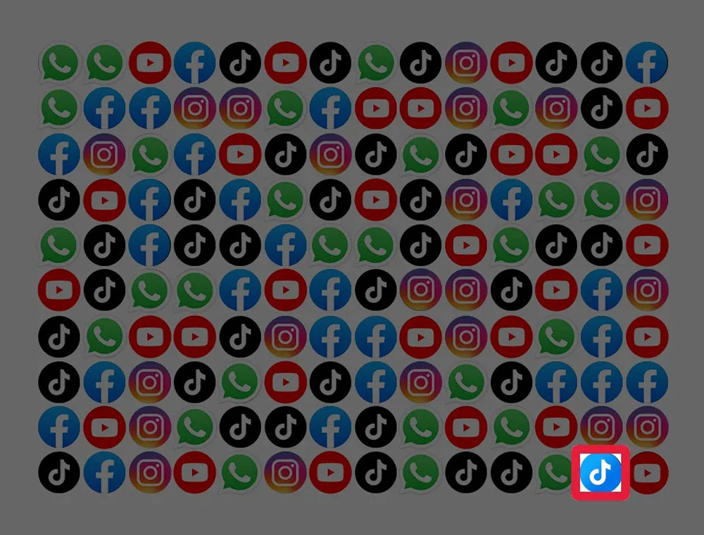 Priešais jus – vaizdas, pilnas populiarių programėlių logotipų: WhatsApp, YouTube, Facebook, TikTok ir Instagram. Atrodo, kad viskas savo vietose. Bet yra vienas niuansas: tarp jų įsiterpė suklastotas logotipas. Ar sugebėsite jį rasti per 10 sekundžių?