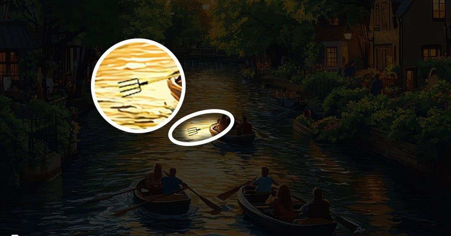 Teisingas atsakymas: paveikslėlyje klaida yra ta, kad vienoje iš valčių žmonės vietoj irklų naudoja šakutes. Žinoma, su tokiu įrankiu toli nenuplauksi.