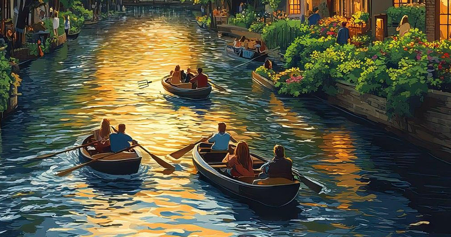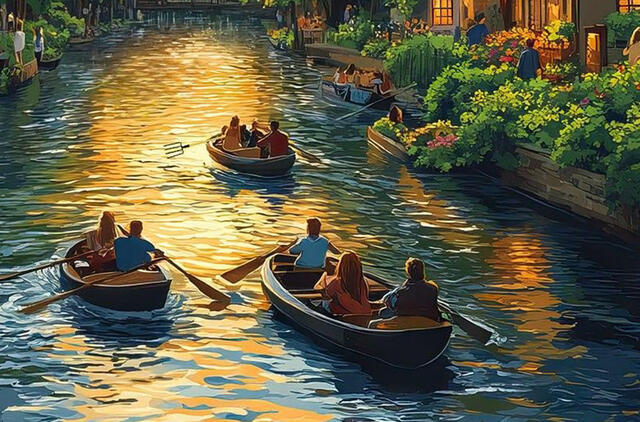 Priešais jus - gražaus vakarinio miesto peizažo nuotrauka. Tarp namų teka upė, kuria plaukia žmonės valtimis. Iš pirmo žvilgsnio vaizdas atrodo normalus, tačiau iš tikrųjų jame yra grubi klaida.