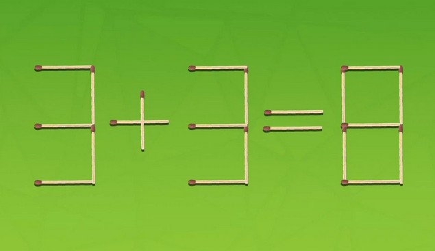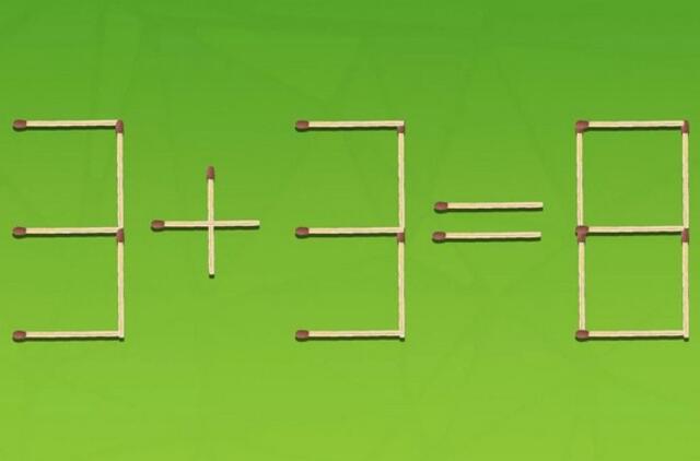 Siūlome jums išspręsti matematinę galvosūkį. Paveikslėlyje matote neteisingą lygybę, sudėliotą iš 21 degtuko: 3 + 3 = 8. Jums reikia ją pataisyti, perkeliant tik du degtukus į kitą vietą per 10 sekundžių.