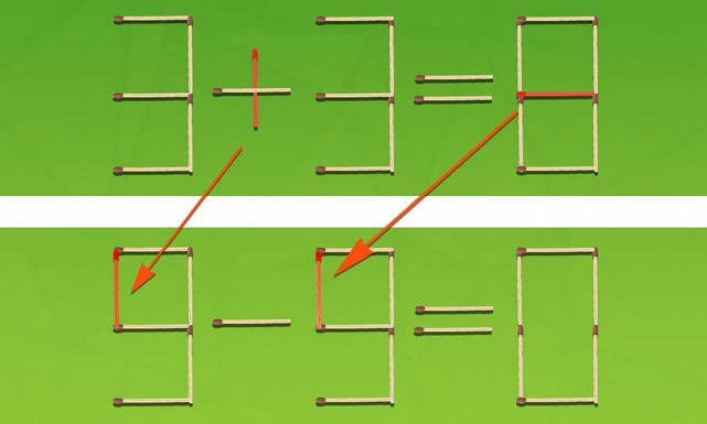Kad lygybė taptų teisinga, reikia nuimti vertikalų degtuką nuo pliuso ženklo ir padėti jį ant viršutinės pirmojo trejeto dalies, paverčiant jį devynetu.