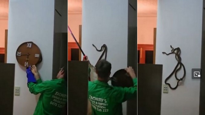 Vaizdo įraše, kurį nufilmavo gyvatės gaudytojas, vadovaujantis Zachery's Snake and Reptile Relocation kompanijai, matyti, kaip gyvatės artėja prie sienos.