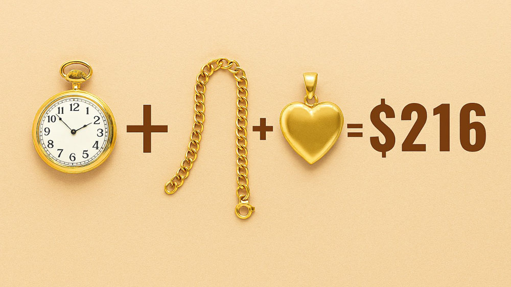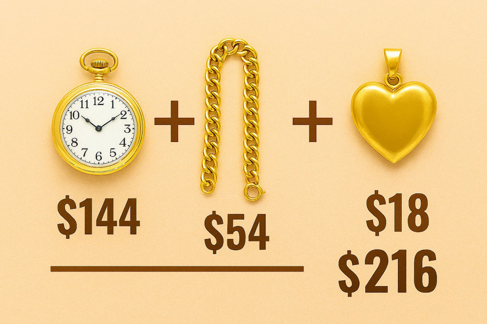 (2)„Vyras nusipirko laikrodį, grandinėlę ir pakabuką už 216 dolerių. Laikrodis ir pakabukas kartu kainuoja tris kartus brangiau nei grandinėlė, o grandinėlė ir pakabukas kainuoja dvigubai pigiau nei laikrodis. Kiek kainuoja kiekvienas daiktas?“