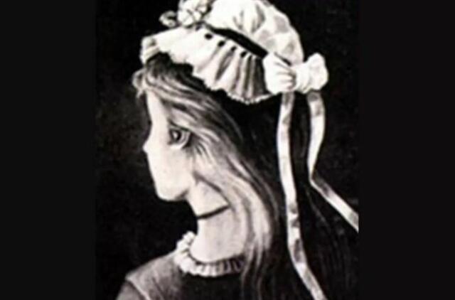 Pažvelkite į raudoną liniją, kuria apvestas merginos veidas: ji dėvi kyką su kaspinais, žvelgia į šoną.
