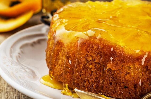 - Iškepusį dar karštą pyragą užpilkite apelsinų sirupu ir palikite atvėsti.
