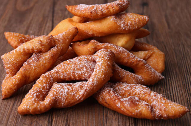 Iškočiotą tešlą supjaustome trikampėmis ar keturkampėmis juostelėmis, įpjauname kiekvienos juostelės vidų ir vieną juostelės galą ištraukiame per įpjovą.