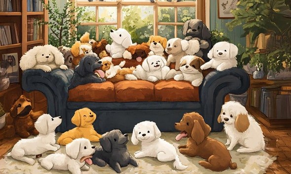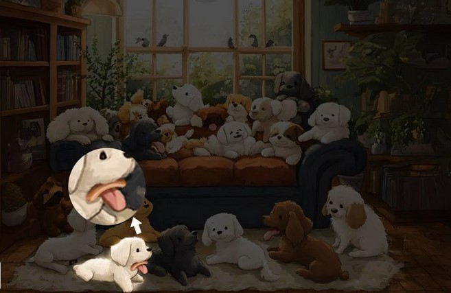 Priešais jus yra kambarys su daugybe žaislinių šunų. Gyvūnų galima pamatyti ant sofos ir kambario grindų, tačiau neleiskite savęs apgauti. Reikalas tas, kad tarp jų slepiasi tik vienas tikras šuo.