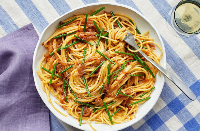 Šaltinis: https://www.bonappetit.com/recipe/jammy-onion-and-miso-pasta