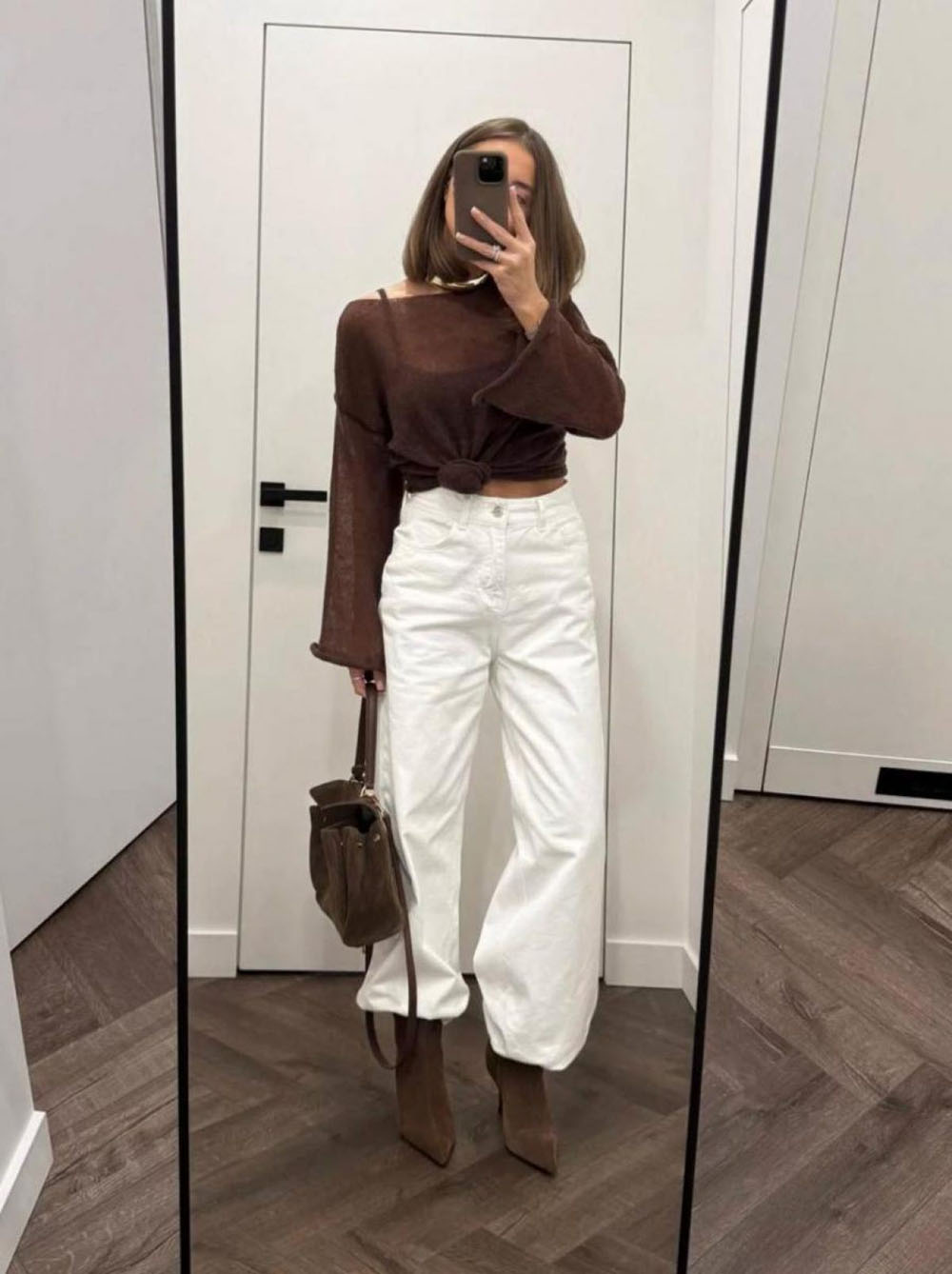 Ypatingą dėmesį Andre Tanas pataria atkreipti į rudus džinsus, kurie tapo 2026 metų pavasario tendencija. Geriausiai jie derinami su: