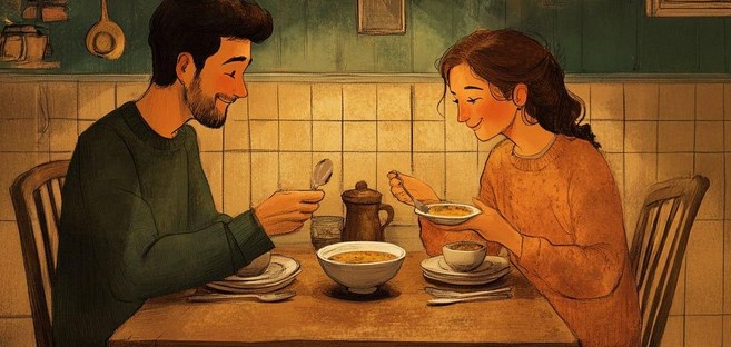 Priešais jus - vyras ir moteris, kartu vakarieniaujantys po sunkios darbo dienos.