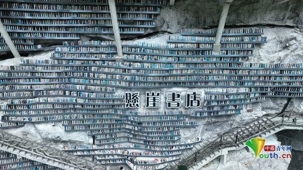 Ši unikali biblioteka, oficialiai atidaryta 2025 m. gegužę, greitai išpopuliarėjo Kinijos socialiniuose tinkluose. Tūkstančiai knygų išdėliotos specialiose lentynose palei nelygias groto sienas.