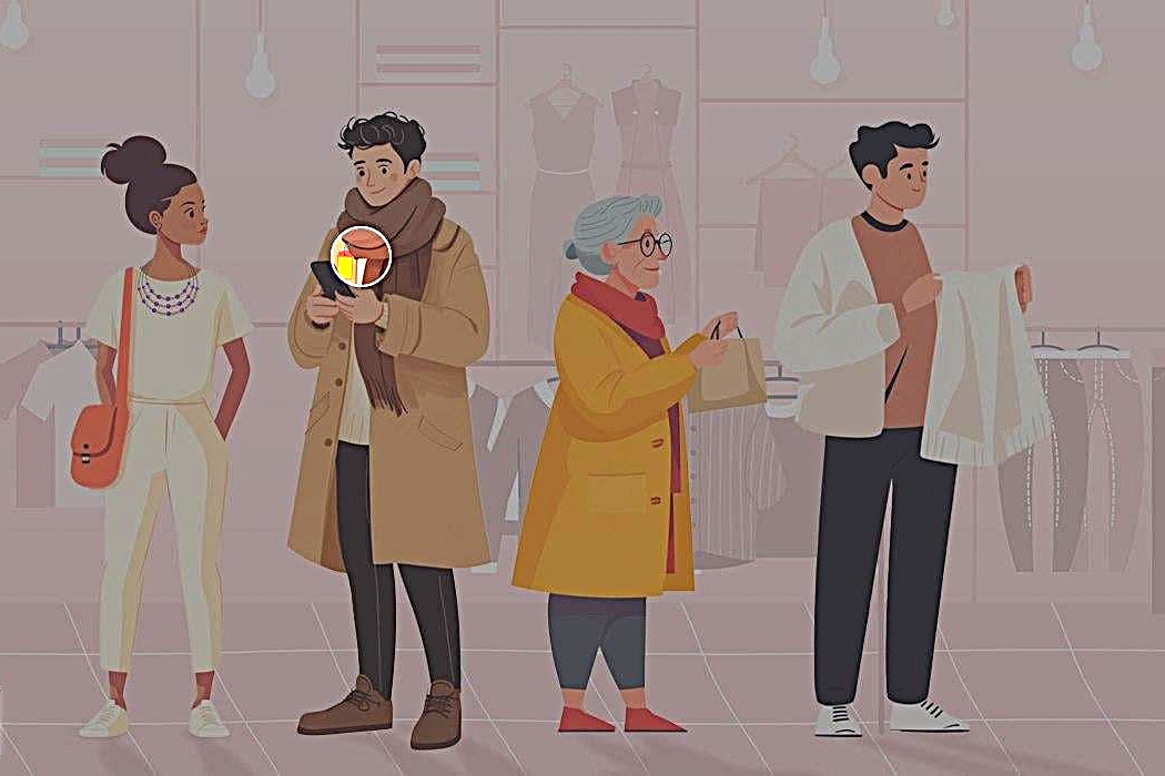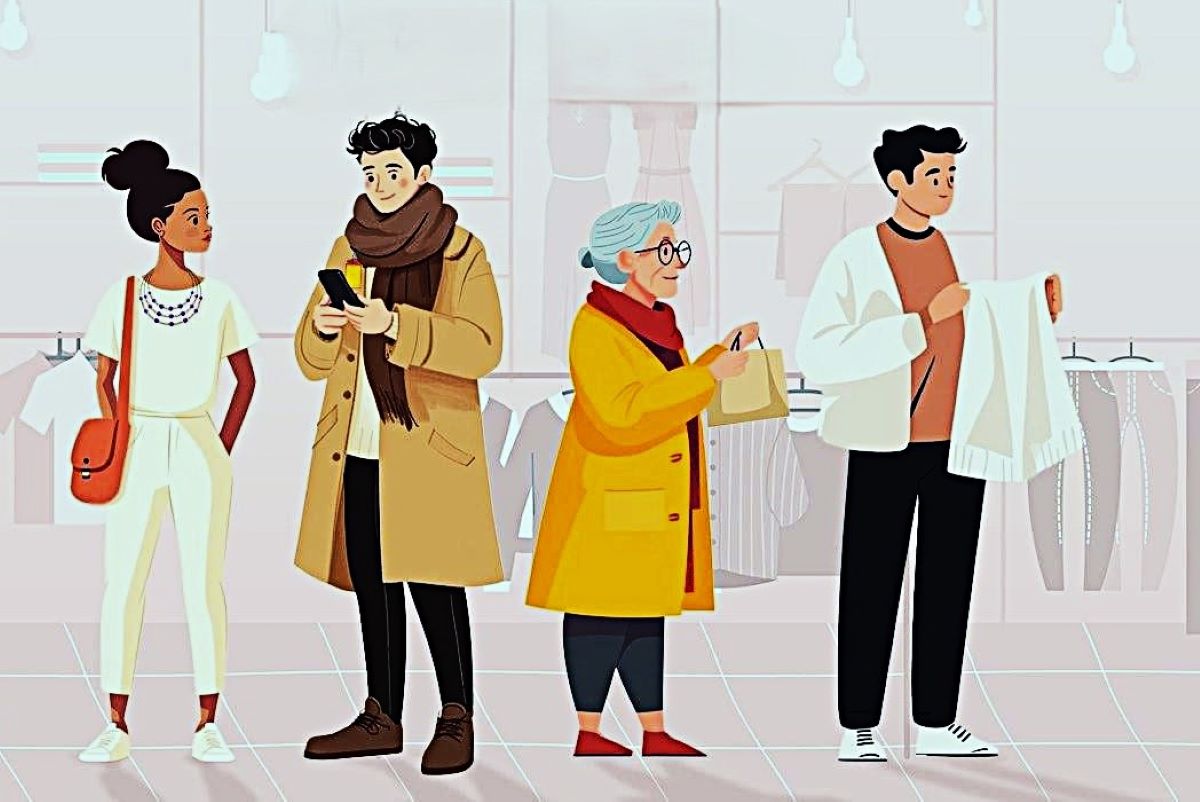 Jie yra drabužių parduotuvėje, apžiūrinėja prekes arba laukia draugų.