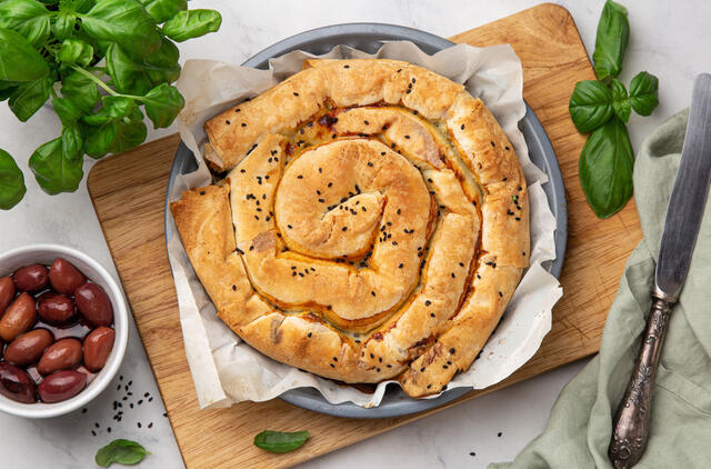 500 g smulkintų špinatų, ryšulėlio smulkintų petražolių, 1 didelio, supjaustyto svogūno, 2 smulkintų česnako skiltelių, 4 šaukštų alyvuogių aliejaus, 4 kiaušinių, 200 g „Eridanous“ fetos sūrio, 20 g krapų, druskos, juodųjų pipirų, sluoksniuotos tešlos lakštų.