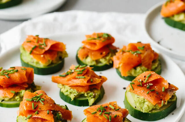 Šaltinis: https://downshiftology.com/recipes/smoked-salmon-avocado-cucumber-bites/