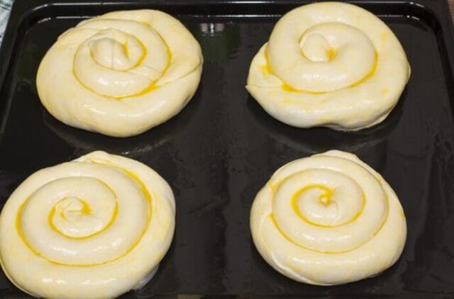 - Iš tešlos suformuokite bandeles. Aptepkite jas kiaušinio trynio ir pieno mišiniu.