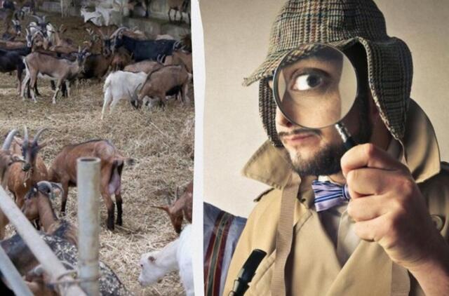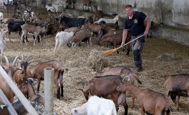 Dešimtys ožkų ganosi aptvare, o ūkininkas valo sausą žolę.