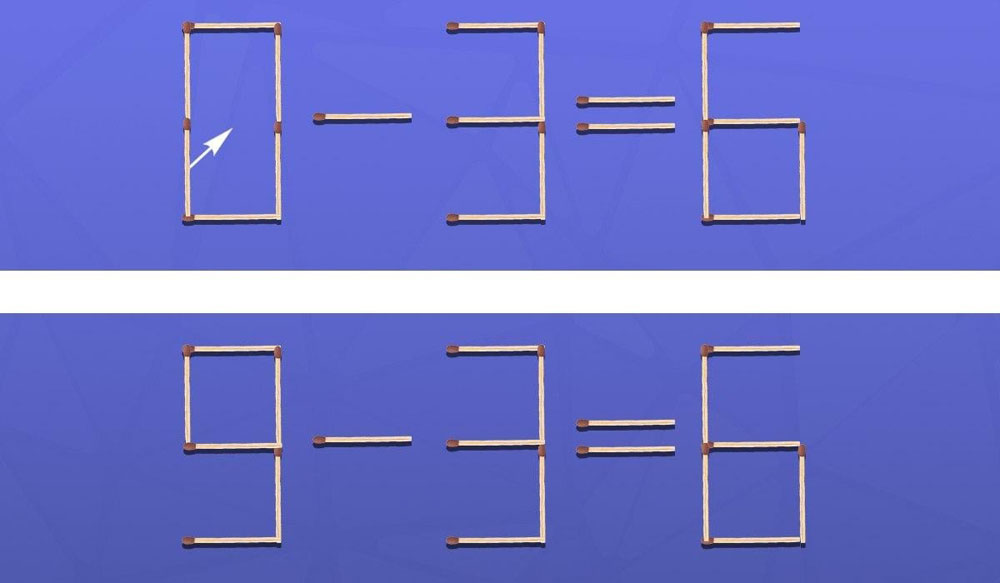 Taigi, žemiau esančiame paveikslėlyje matote iš degtukų sudėliotą matematinę lygybę 0-3=6. Akivaizdu, kad čia veliasi klaida.