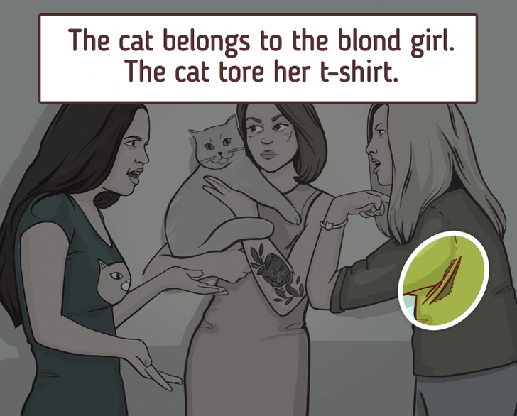 Teisingas atsakymas - mergina su žaliu megztiniu. Pastarasis sudraskytas dėl nenumaldomo katės žaismingumo.