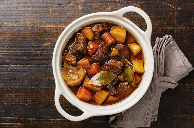 - Troškinkite bent 2 val., kol mėsa ir daržovės taps minkštos.