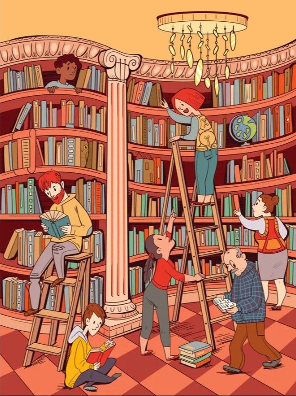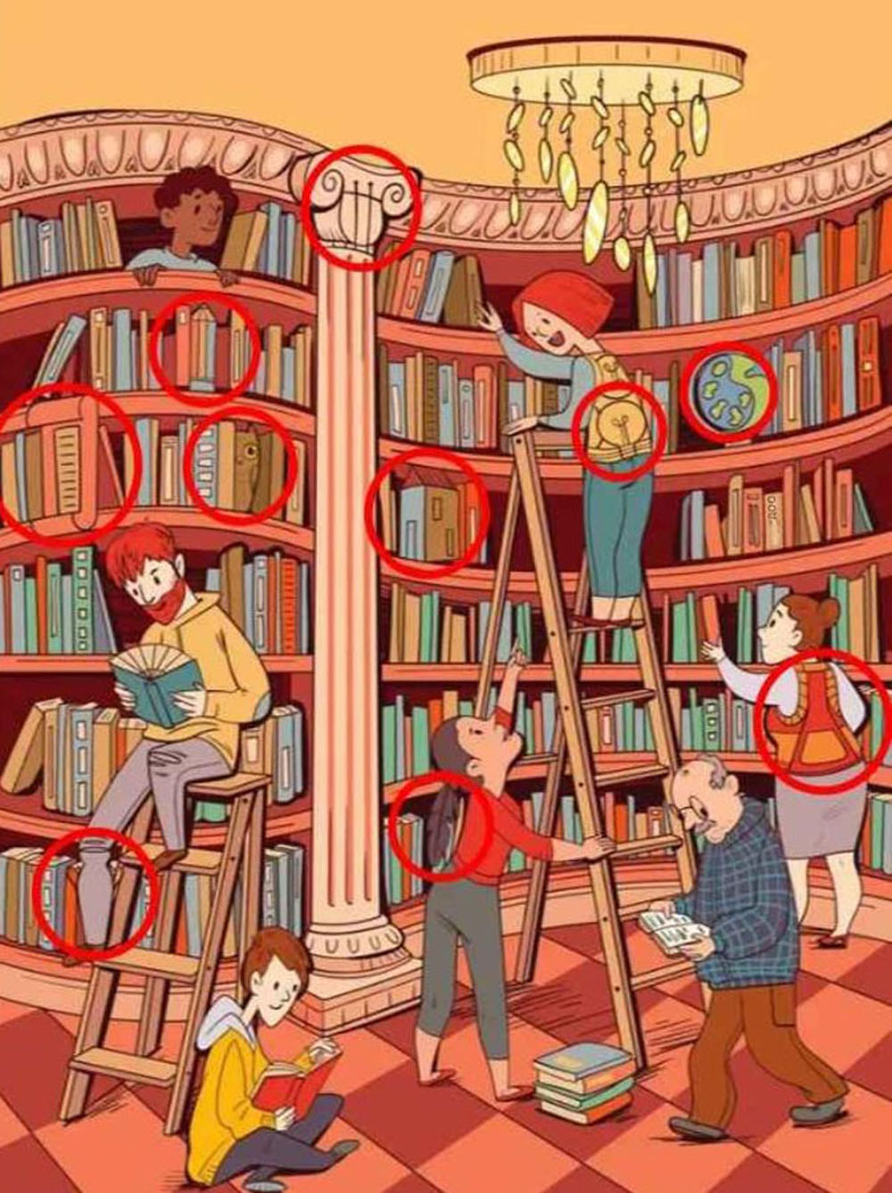 Nors šis žaidimas neturi laiko limito, neatsipalaiduokite per daug: visi daiktai yra puikiai įsilieję į foną, o lentynos sunkios nuo knygų įvairių formų ir dydžių. Jų gausu ir ant grindų. Berniukas ir vyras skaito, bibliotekininkai tvarko viršutines lentynas.