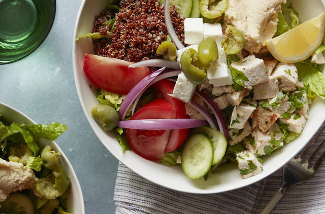 Paruoškite salotas. Sudėkite paruoštas bolivinės balandos sėklas, agurkus, pomidorus, svogūną, feta, vištieną, alyvuoges, humusą ir citrinos griežinėlius.