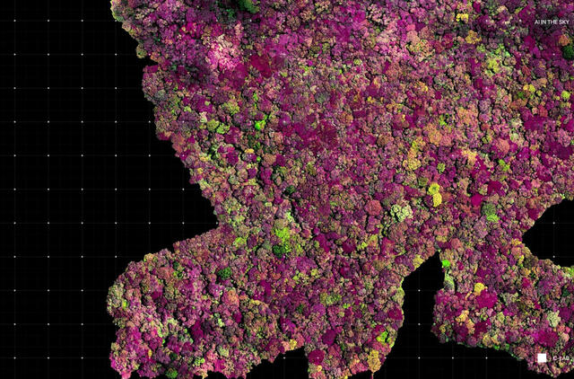 Ieškodami E. woodii patelės, naudojome naujoviškas technologijas, kad galėtume ištirti miško plotus iš vertikalaus stebėjimo taško. 2022 m. ir 2024 m. mūsų tyrimai dronais apėmė 195 akrų arba 148 futbolo aikščių plotą, o iš tūkstančių dronais padarytų nuotraukų buvo sudaryti išsamūs žemėlapiai. Tai vis dar nedidelė dalis Ngoye miško, kurio plotas siekia 10 000 akrų.