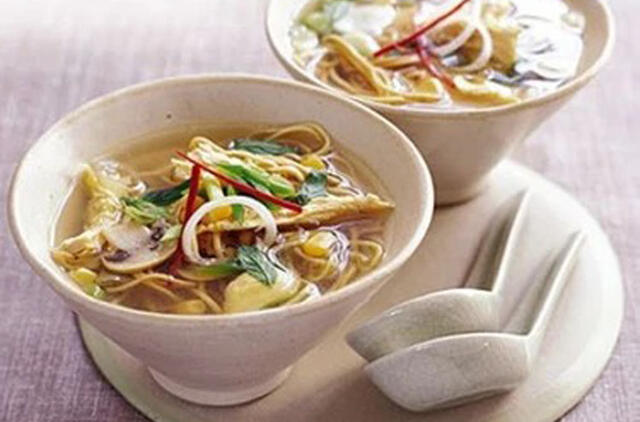 Supilkite į du dubenėlius, patiekite su svogūno laiškais, mėtos/baziliko lapeliu. Patiekite su sojos padažu.