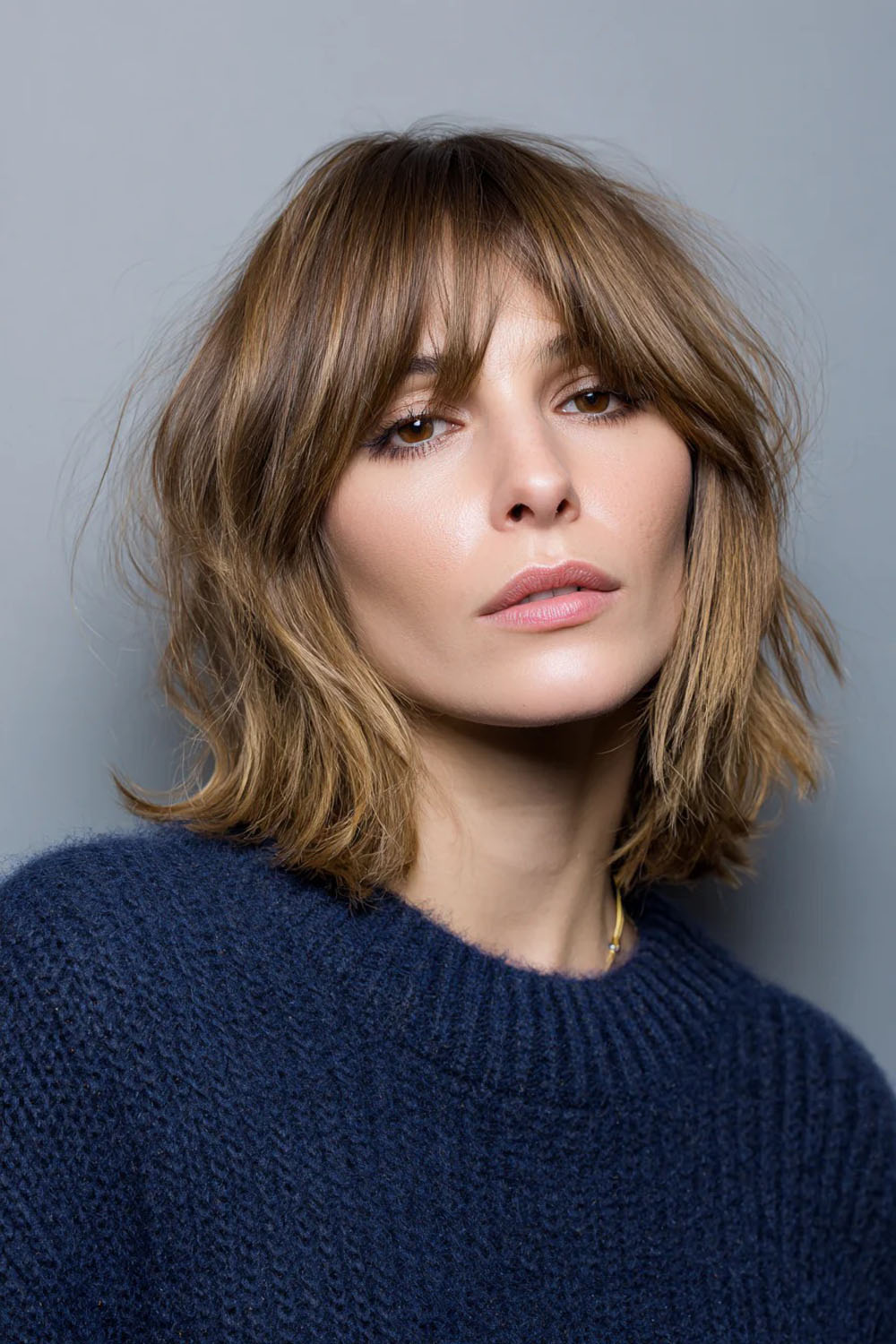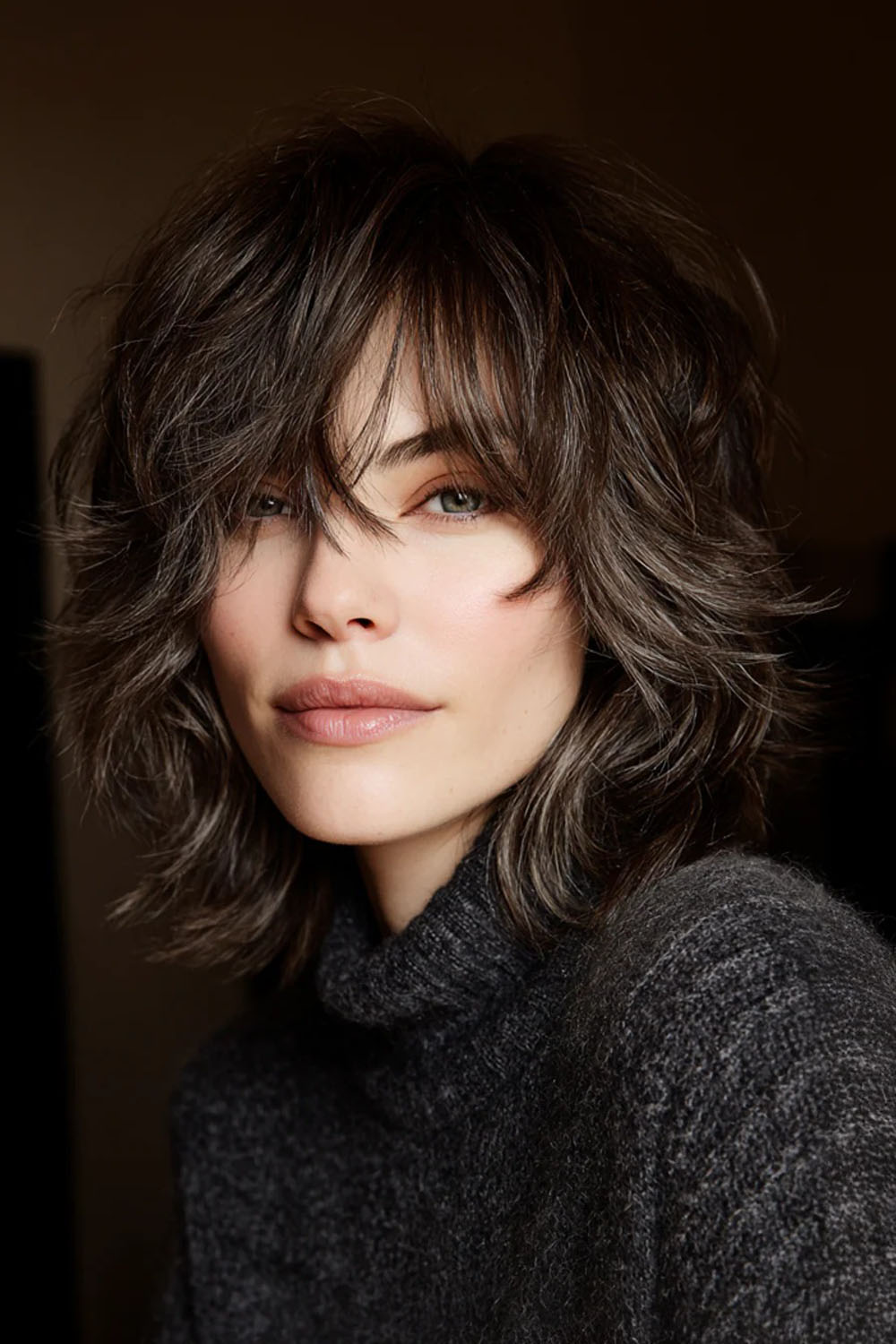 Brandžiame amžiuje „wolf-cut“ atrodo ypač sėkmingai, kai sluoksniai išlieka tekstūriški, bet perėjimai yra švelnesni. Tai suteikia apimties viršugalvyje ir lengvumo ties veidu. Tamsiai peleninis šatenas įvaizdžiui suteikia užbaigtumo ir modernumo.