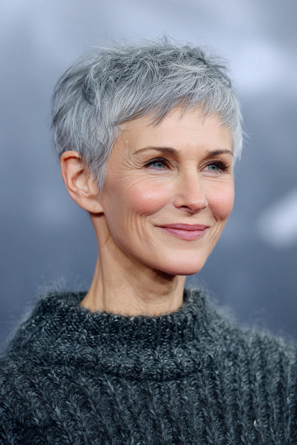 Švari pakaušio linija ir netvarkingas viršus sukuria šiuolaikišką siluetą, kuris pastebimai jaunina. Grafito atspalvis suteikia žiliems plaukams gylio ir kilnumo.