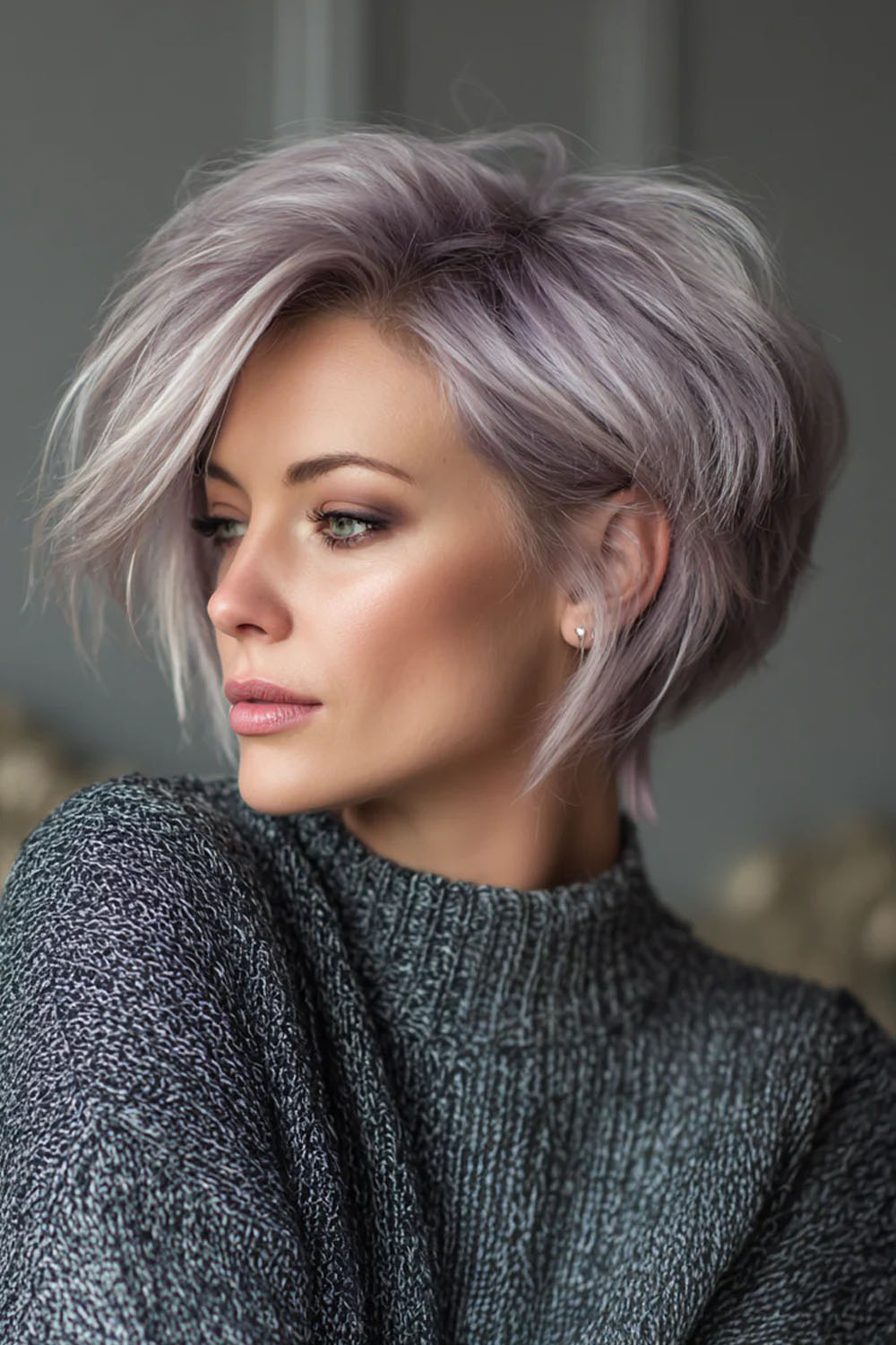 Pailgintas „kare“ ištempia kaklo liniją ir vizualiai suvienodina veido ovalą. Lengvas alyvinis niuansas žilame fone atrodo kūrybiškai, bet tinka kasdienai.
